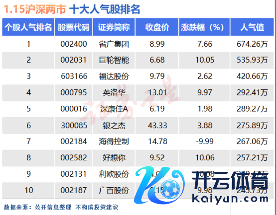 1月15日沪深两市有所回落,成交量有所放大。板块上传媒、光伏涨幅居前,电源确立、油气开发做事跌幅居前。东谈主气股方面巨轮智能、英洛华、好想你、利欧股份、广百股份收于涨停,涨停个股占据东谈主气股半壁山河,海得截止跌停成为十大东谈主气股中独一下落个股。底下是本日十大东谈主气股排行的刺目情况。