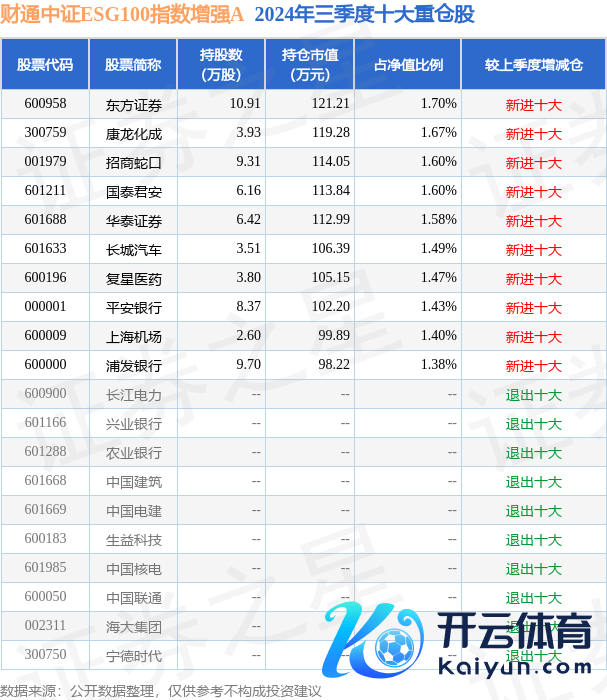 财通中证ESG100指数增强A为指数型-股票基金,证实最新一期基金季报长远,该基金钞票建树:股票占净值比94.11%,无债券类钞票,现款占净值比6.44%。基金十大重仓股如下: