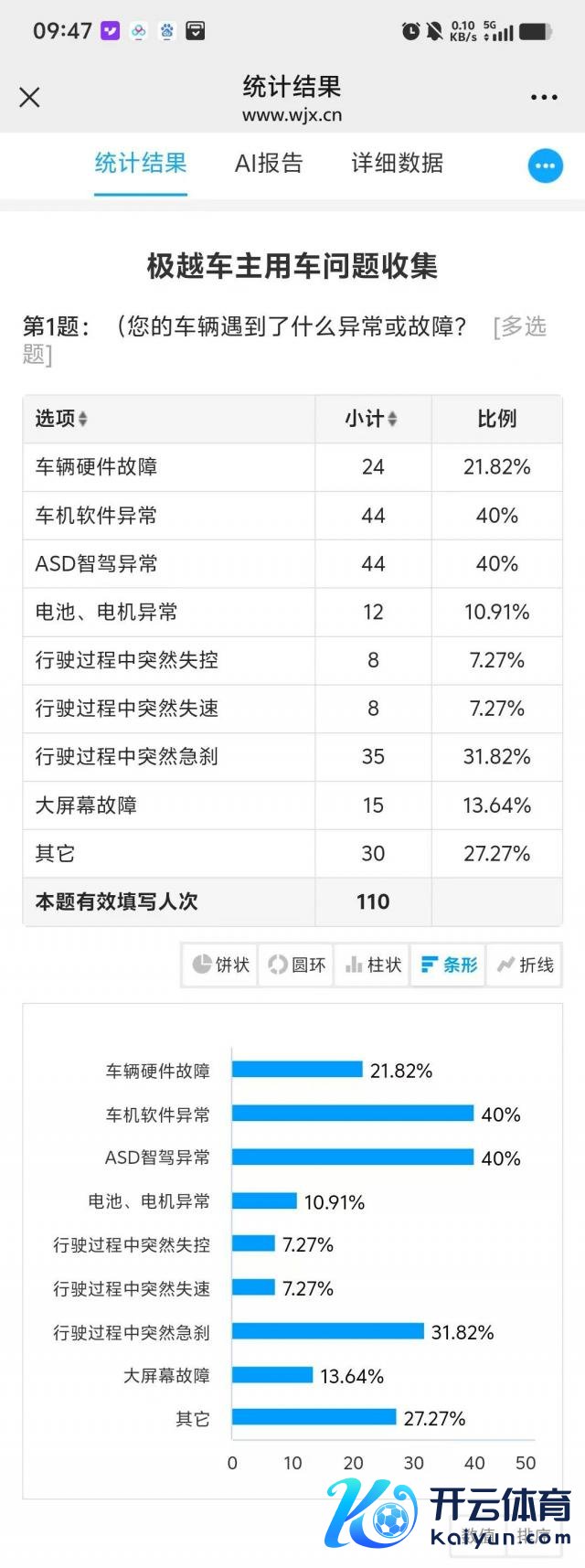针对面前车友们遭受的问题,张先生在车友群里作念了一次调研,共采集到 110 位车主的响应信息。拜访数据知道,车机软件极度、ASD 智驾极度是车主遭受最多的问题,占比均为 40%。其次,行驶经过中眨眼间急刹也较为越过,占比超 31%。此外,车辆硬件故障、大屏幕故障、电板电机极度、行驶经过中眨眼间失速或失控亦然面前车主遭受的问题。